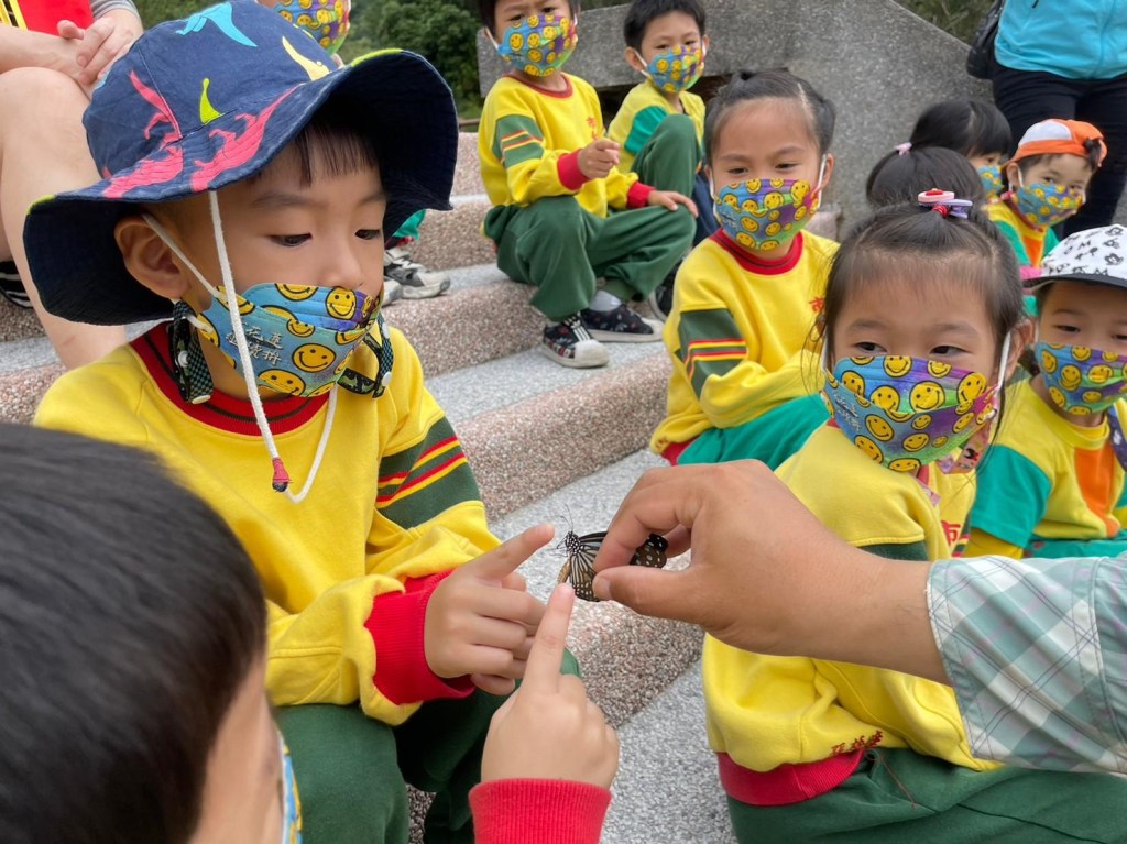 不只是聽故事,講師讓小朋友近距離觀察蝴蝶,還能用手輕輕觸摸蝴蝶,讓小朋友運用到身體器官的觸覺、視覺。小朋友小心翼翼的伸出手指放在蝴蝶前方,讓蝴蝶的觸角碰了碰手指,小朋友也笑著說,「好癢!」。