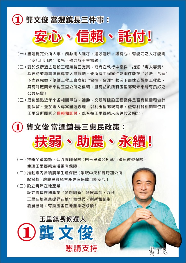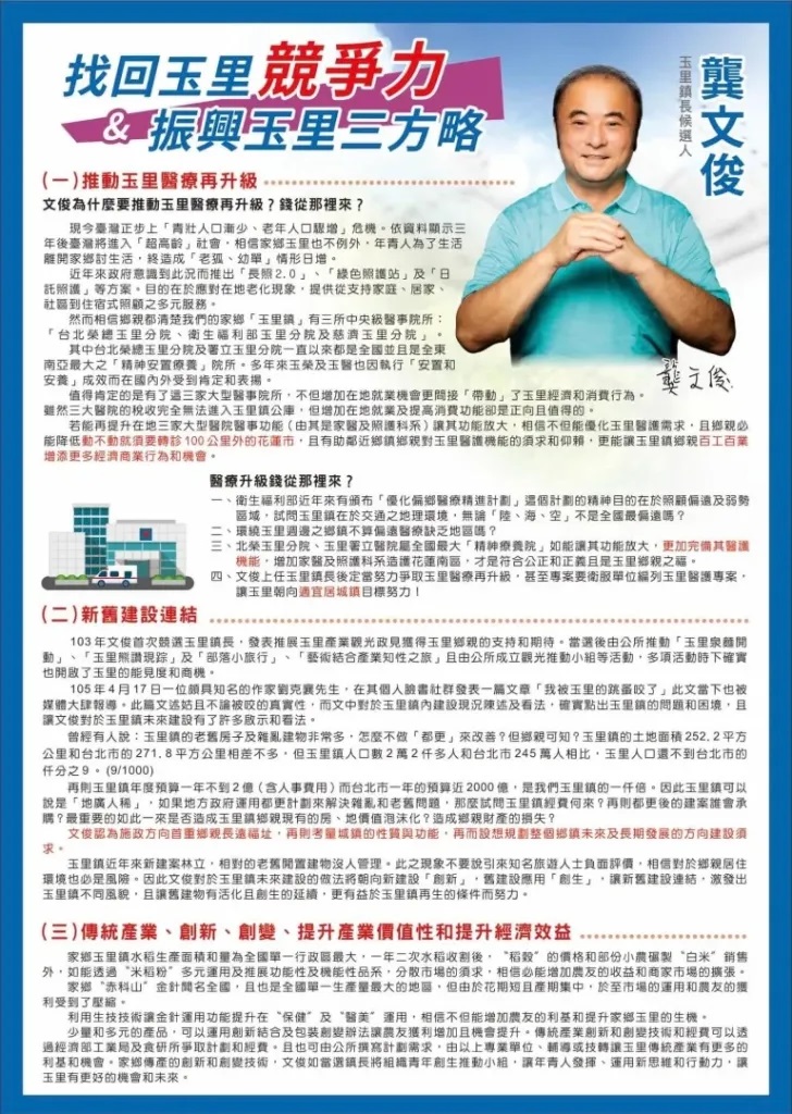 龔文俊,一位獸醫出身的農業奇才,歷經玉溪地區農會總幹事、花蓮縣議員、玉里鎮鎮長,在位期間做甚麼像甚麼,功勳卓著讓他廣結了許多好人脈。他說:我不是一個完美的人!但我不願看到我的家鄉停滯不前!更不願看到有心為玉里努力的公所員工沒有方向且不安!所以為了玉里未來進步和突破,他再次參選玉里鎮長。