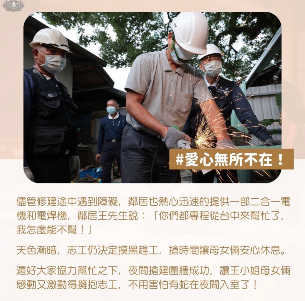 玉里靜思堂負責花蓮南區的慈濟事務,帶領全臺灣各地調過來的慈濟營建工班,針對貼單建築持續修繕中。自昨日起,新的工班進駐玉里靜思堂,全力進行黃紅單的修建與拆除,並施建組合屋。