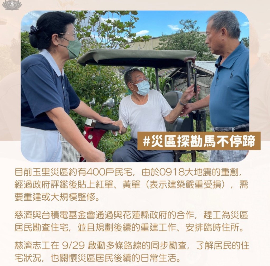 0918地震造成建築物傾斜、龜裂等問題,依規定所整理的白單、紅單、黃單建築,目前總共259件是由玉里地區慈濟負責,現已完成138件修繕工程。