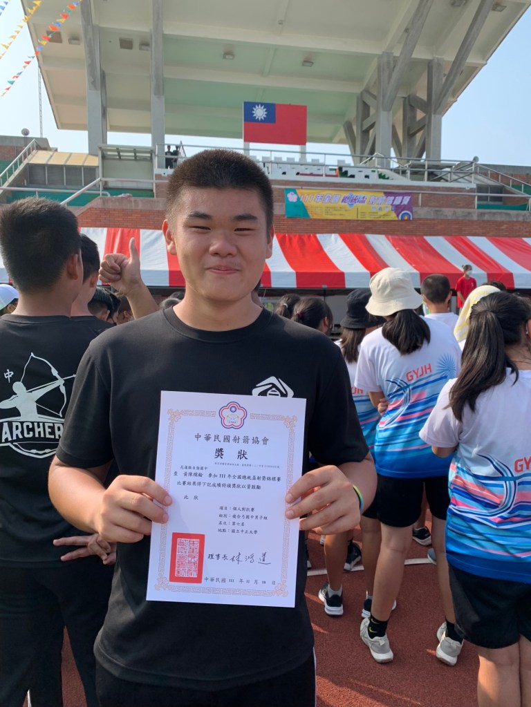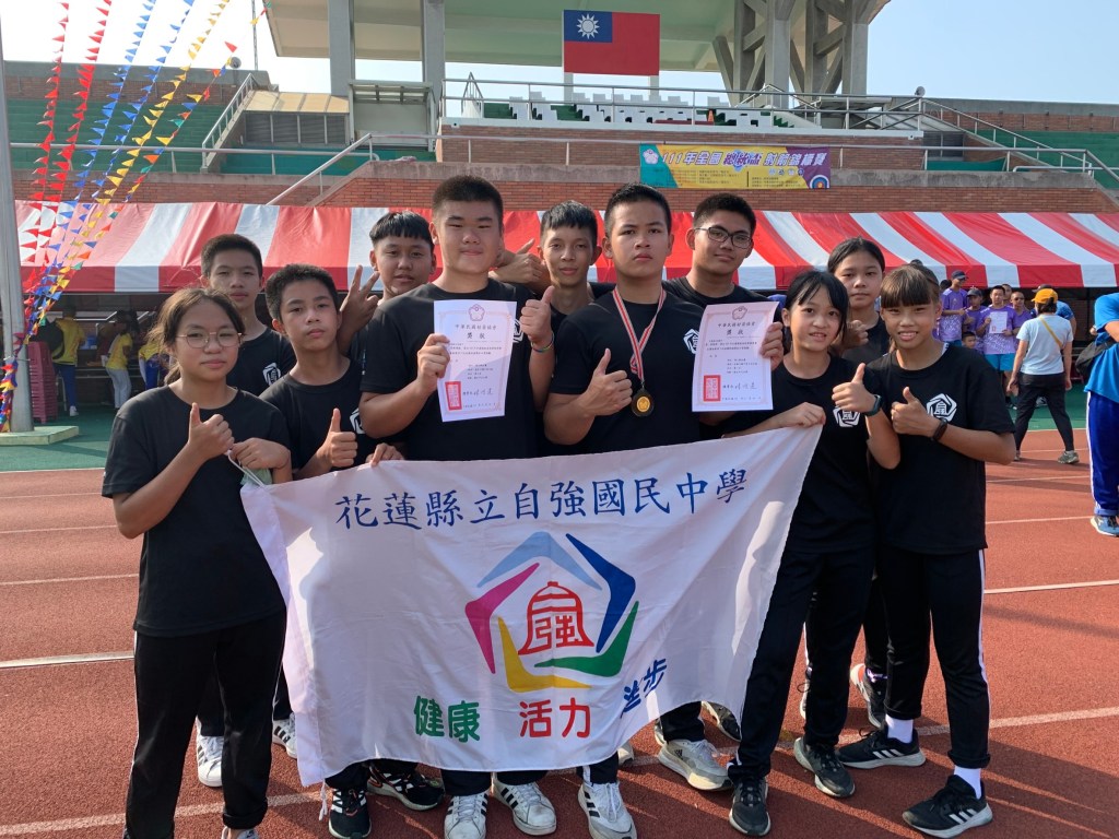 花蓮縣立自強國中-由校長 劉上民、教練 彭暐婷領軍,一連四日的賽程,徐晧哲選手從第一日的排名賽位居第四名,堅持不放棄的決心,一路從32強對抗賽,以6:0的比數搶下金牌戰的門票;晉級金牌戰中一路穩扎穩打,最終以6:0獲得最終的勝利。另外,複合弓選手黃陳襦翰,第一次挑戰這個弓種,在此次比賽獲得九年級組個人對抗賽第七名的好成績。