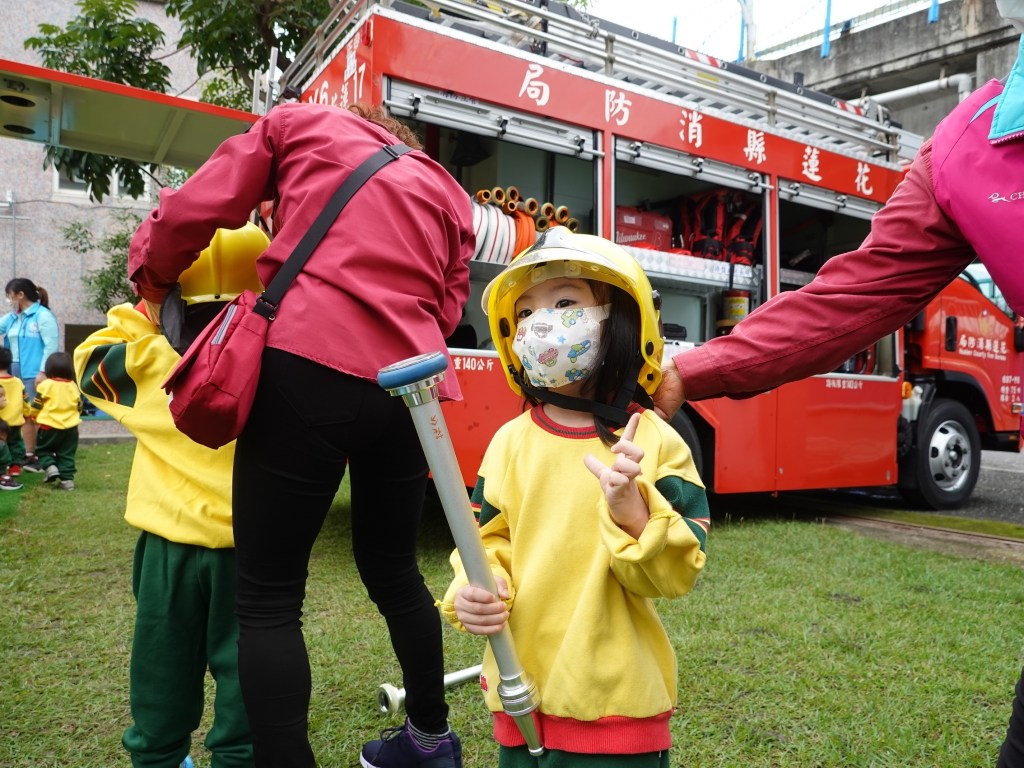花蓮市立幼兒園今日進行防震及消防複合式演練,包含防震演練、防災宣導、滅火體驗,還有消防車介紹,藉由身歷其境的體驗,讓孩子們萬一面對災害來臨時可以有更多正確的判斷與應變能力。 幼童聽到地震警示聲作響,立刻完成了「趴下、掩護、穩住」動作;隨後,火警警報響起,小朋友跟遵照「不推、不跑、不語」的指示,盡速疏散至戶外集合點。隨後在消防哥哥姐姐的宣導中,了解消防安全知識。 消防隊把消防車開到幼兒園,孩子們看到消防車都十分的興奮,消防員讓小朋友們參觀了消防車與隨車器材裝備,並讓孩子穿戴消防裝備及坐上駕駛座。 志工帶孩子們體驗在火災發生時使用的噴水柱,還有體驗濃煙模擬,讓小朋友了解煙流動的路徑;而幼兒園老師在消防人員指導「拉、瞄、壓、掃」的口訣下,實地操作滅火器。對首次參加複合式演練小班的孩子來說,是場新鮮的體驗。 幼兒園長李妃伶表示,為了提高幼兒園的應急防災能力,幼兒園每年都有三次的演練,上下學期各一次的防震及消防複合式演練,以及每年國家防災日演練,希望透過經驗累積,當孩子真的遇到危險時,都能很快的反應過來,將課程所學運用在生活經驗上,能在第一時間保護自己。