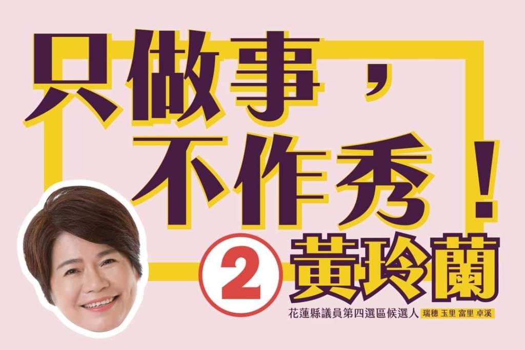 只做事、不作秀,我是花蓮縣第四選區縣議員候選人2號黃玲蘭。
