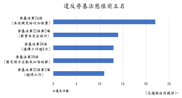 花蓮縣政府社會處統計111年1月至10月止違反勞動基準法裁罰結果,共有 54家事業單位受裁處,總計裁罰金額達新臺幣(以下同)394萬元。事業單位違反勞基法受裁罰的違規態樣以「未依法給付加班費」最多,佔22.9%,其次為「薪資未全額給付」,佔12.5%,第三為「連續出勤逾六日,未給予一例一休」,佔10.4%。罰鍰金額最高的前三家業者依序為:花蓮汽車客運股份有限公司(100萬元)、理想大地股份有限公司(21萬元)及聯安保全股份有限公司(19萬)。其中花蓮汽車客運因多次使勞工連續出勤7天以上,未依法給予一例一休,遭重罰100萬元。 花蓮縣長徐榛蔚呼籲,勞動人口為花蓮縣的基石,業者應確實遵守勞動基準法相關的規範,善盡照顧勞工責任,勿使勞工權益受損;社會處將定期於社會處的網站,公布違反勞動基準法業者的名單,以警惕事業單位及供勞工朋友作為求職參考。 配合勞動部「違反勞動基準法裁處罰鍰共通性原則」的修正,花蓮縣政府於111年11月3日修正「花蓮縣政府處理違反勞動基準法案件統一裁罰基準」,針對上市(櫃)公司、國內資本額或國內營運資金超過一億元之事業單位及信用合作社,若3年內違反《勞基法》關於工時、薪資等規定,裁罰金額將從原先最低額2萬元調整到5萬元起跳,並得審酌事業單位規模、違規次數及違法情節加重罰鍰至法定最高額之二分之一(即150萬元)。上述事業單位因已具備專責人員辦理法遵事宜之規模,對於勞工權益保障即應課以較高標準的要求,以善盡企業社會責任。 花蓮縣政府社會處陳加富處長表示,為加強落實企業勞動法令知能及對於勞動基準法認知,協助花蓮縣事業單位恪遵法令義務,減少因不諳法令而致衍生的勞資爭議,縣府社會處除每年辦理勞動法令相關宣導會,亦持續推動「勞動條件落實法遵實施計畫(簡稱法遵訪視)」,協助企業採取適法可行的工時安排及說明各項勞動法令輔導,避免企業因不熟悉法令而受罰,109年至今宣導會參與人次達889人次,實施法遵訪視共390家事業單位。企業若有勞動條件法令輔導需求,可主動申請縣府勞動檢查員進場輔導,落實法遵,保障勞動權益,並降低雇主觸法繳納罰鍰之風險。 自112年1月1日起,每月基本工資由25,250元調整至26,400元;每小時基本工資由168元調整至176元。勞動基準法為規定勞動條件最低標準,勞雇雙方得自由議定工資,但所議定之工資不得低於基本工資,若雇主有違法,將受罰鍰2萬元至100萬元裁處,請各事業單位及早做好準備,以符合規定,避免觸法受罰。以上資訊如有相關疑問可參考花蓮縣政府社會處網站(業務資訊/勞政業務/勞動條件)或洽詢花蓮