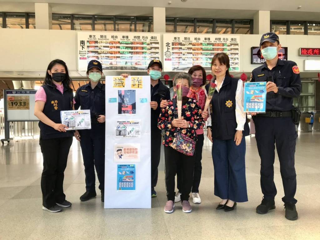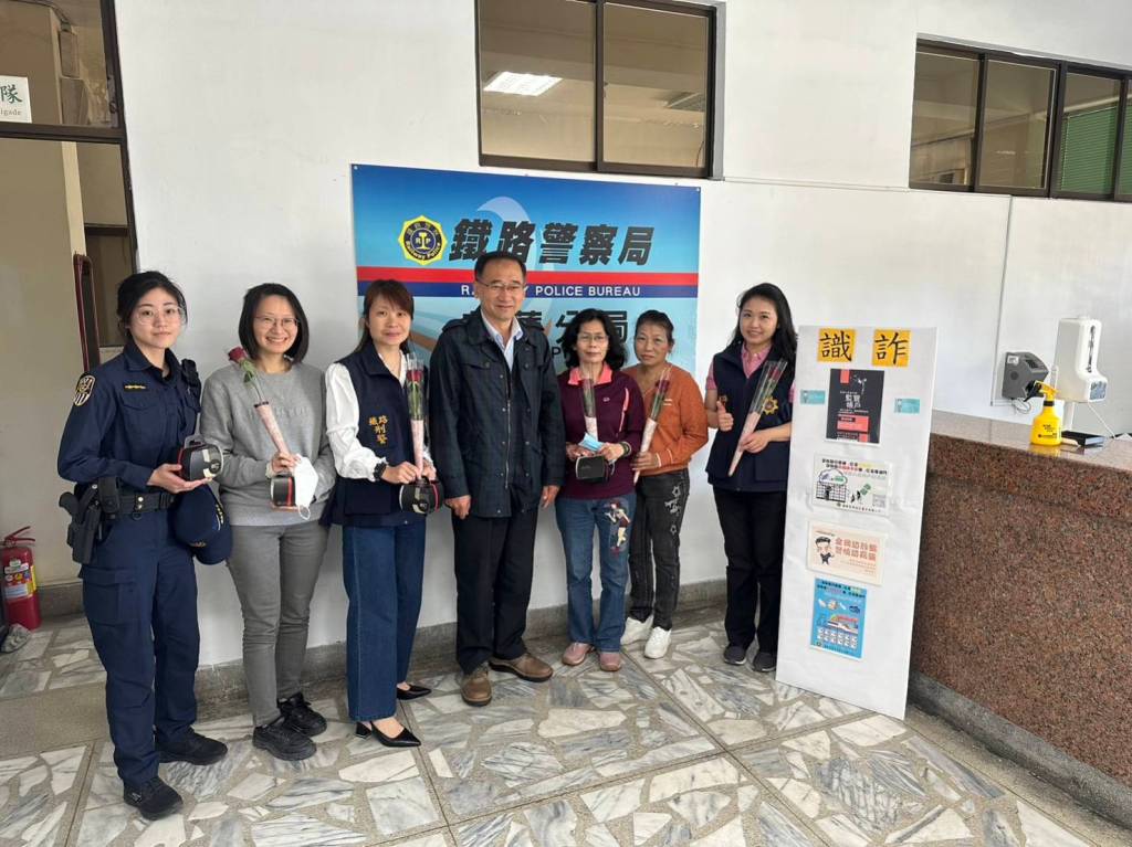 本日為3月8日國際婦女節, 鐵路警察局花蓮分局分局長張天賜特地致贈分局內的女性同仁玫瑰花及蛋糕,感謝並肯定其對於警政工作的努力及奉獻,並由偵查隊及派出所女性同仁,前往站區向旅客宣導、分享親身經驗,以提升民眾自「識詐」、「防詐」意識,並隨時提醒身邊親友避免落入詐騙集團話術、上當受騙,達到「阻詐」的效果。