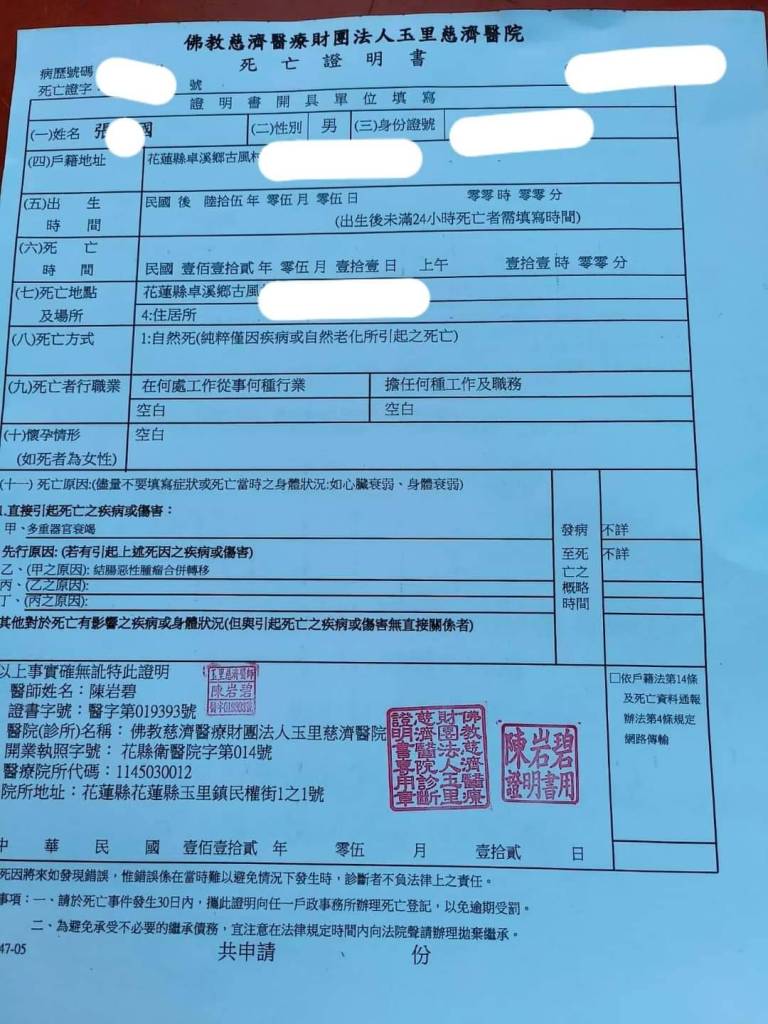 花蓮縣卓溪鄉古風村的一名張姓男子,在5月11日上午11時,因結腸惡性腫瘤導致多重器官衰竭,經院方急救後,仍然不治,於院中辭世,享年僅47歲。