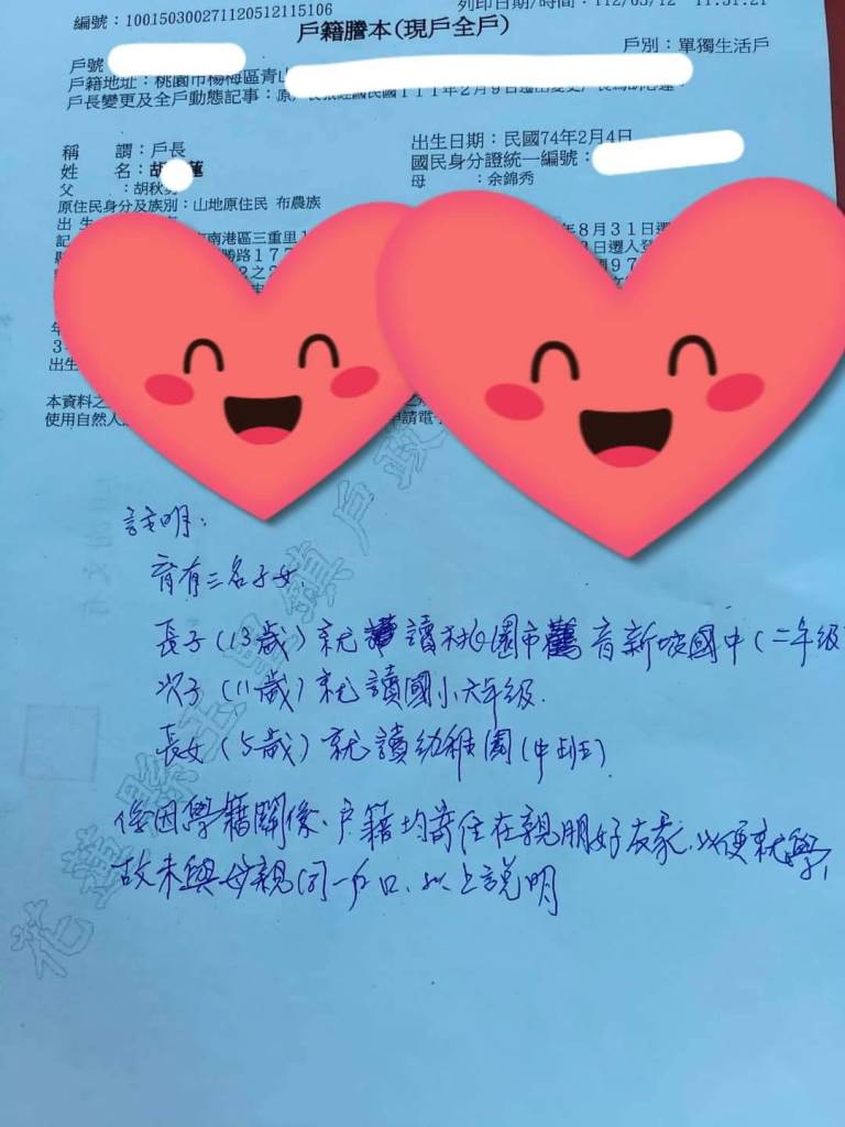 亡生者父親已往生、母親已70幾歲,亡生者還有弟弟(身心障礙患者)及妹妹(已嫁到外地),亡生者與妻子(38歲,家管)育有三名子女(長子13歲,就讀國中二年級;次子11歲,就讀國小六年級;長女5歲,就讀幼稚園中班)。