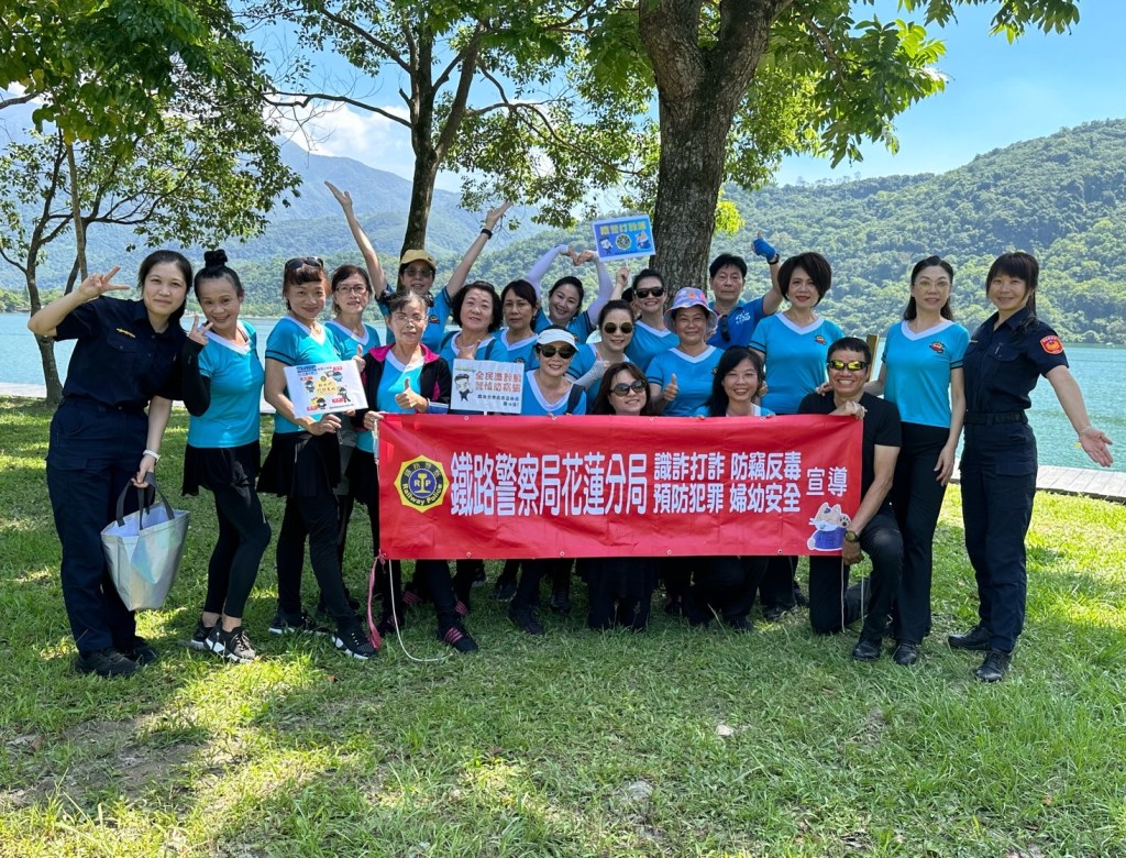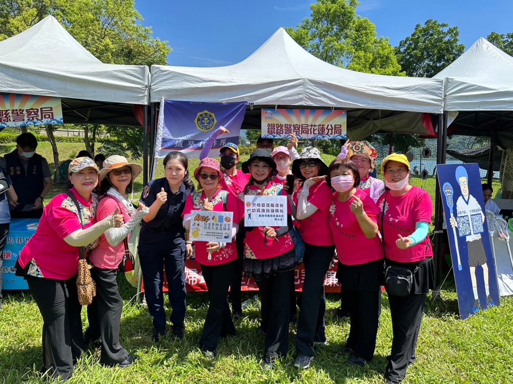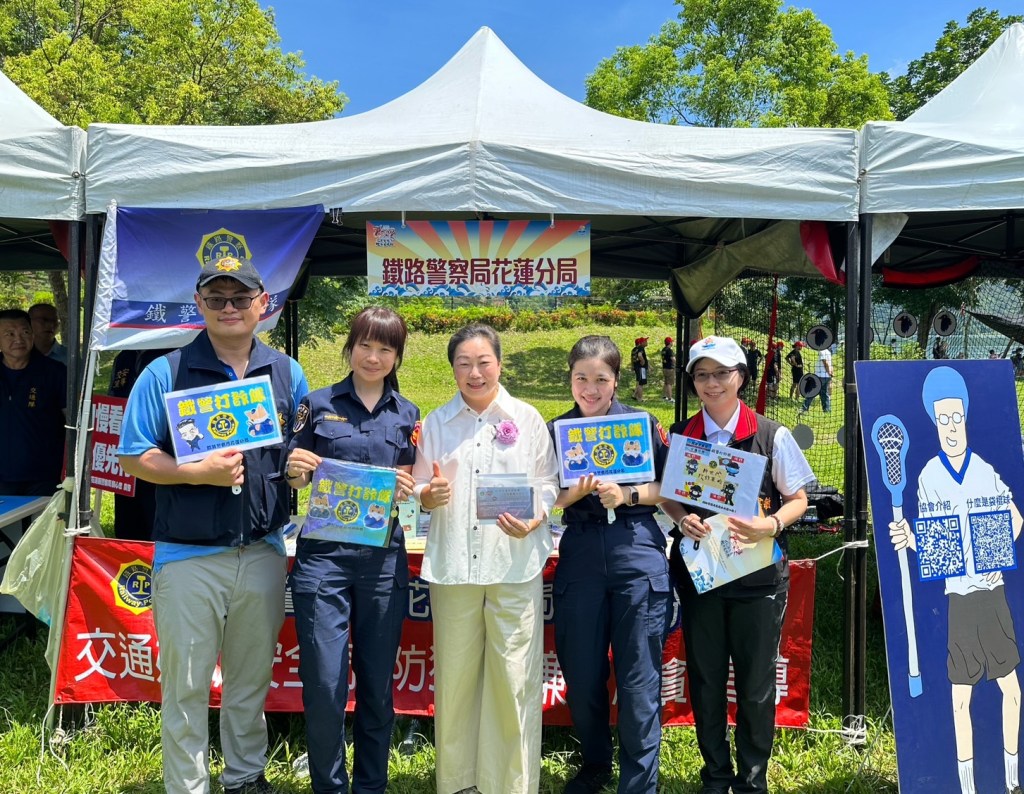 鐵路警察局花蓮分局的員警,精神抖擻的拉開宣導布條於現場設置宣導攤位,穿梭會場與民眾近距離接觸,發放傳單、宣導品,藉以宣導鐵路平交道安全及介紹最新識別詐騙及防制詐騙的技巧。