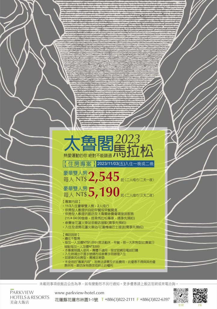 2023太魯閣峽谷馬拉松即將在11月4日開跑,今年共計有超過1萬3千多名幸運者中籤。花蓮美侖大飯店結合運動與觀光,推出優惠住房專案,比賽當日由專車接送跑者直達會場,還贈送能量補給餐盒,讓跑者補充體力,活力充沛奔向勝利終點!
