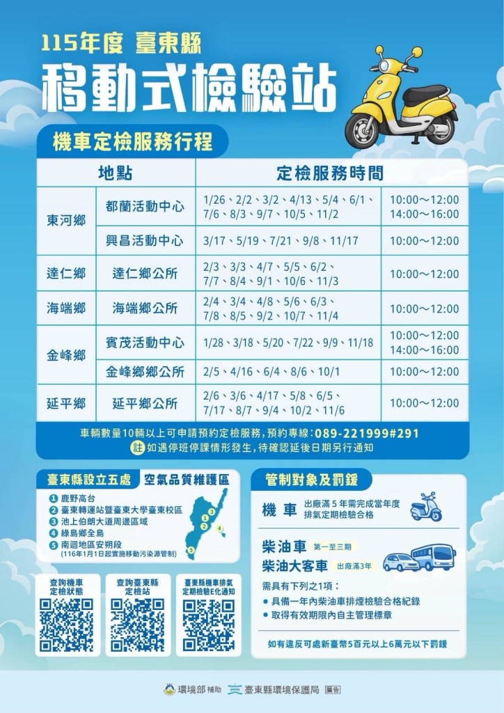 為實踐2050淨零碳排目標,機車排氣定檢不僅是法規要求,更關係到全民健康與環境永續,環保局請所有車主主動定期檢驗、妥善保養車輛,避免成為「烏賊車」,讓我們一起努力,打造清新無污染的臺東。