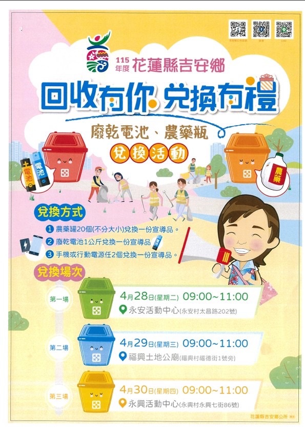 後續於4月29日假福興土地公廟、4月30日假永興活動中心兩場次宣導活動,邀請鄉民踴躍帶著廢電池、農藥瓶、手機或行動電源到現場兌換宣導好禮,一起讓居家環境更潔淨,齊力守護宜居家園。