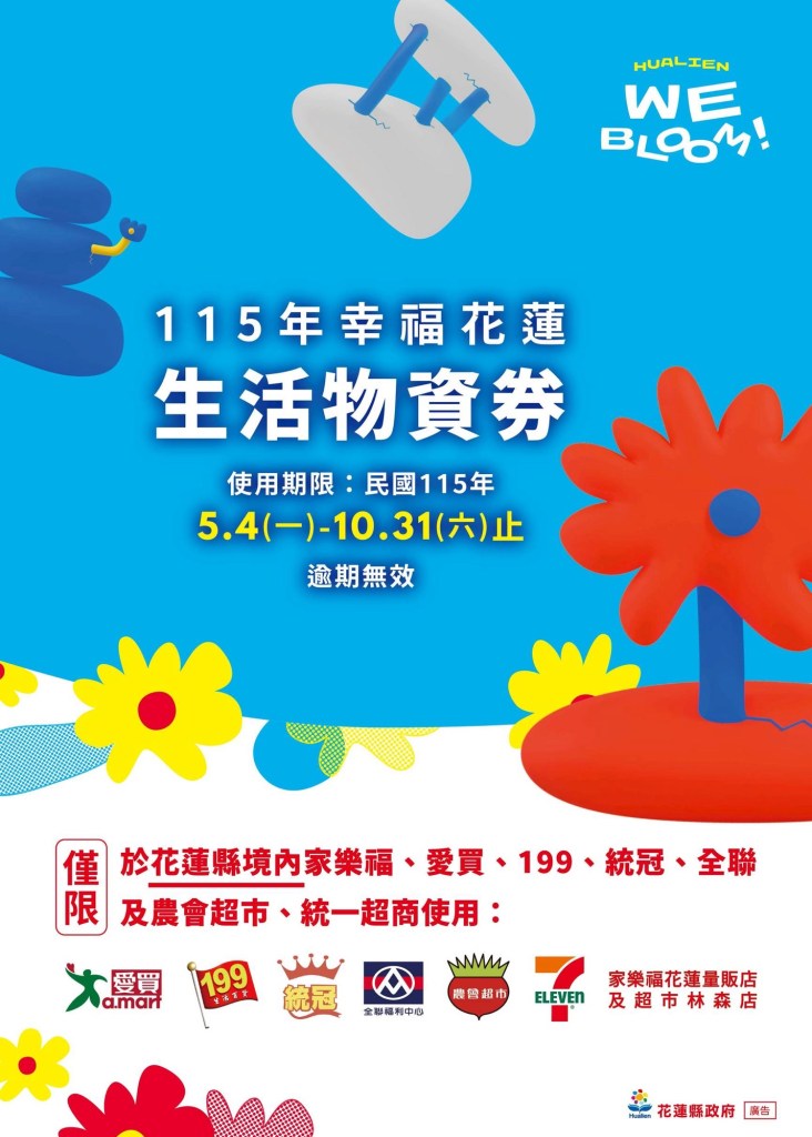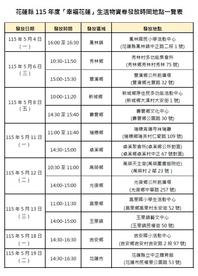 花蓮縣政府115年度「幸福花蓮」生活物資券將於5月4日至19日於各鄉鎮市發放,符合資格者可領取5張面額200元的物資券,每人額度1,000元,以減輕弱勢民眾生活壓力。