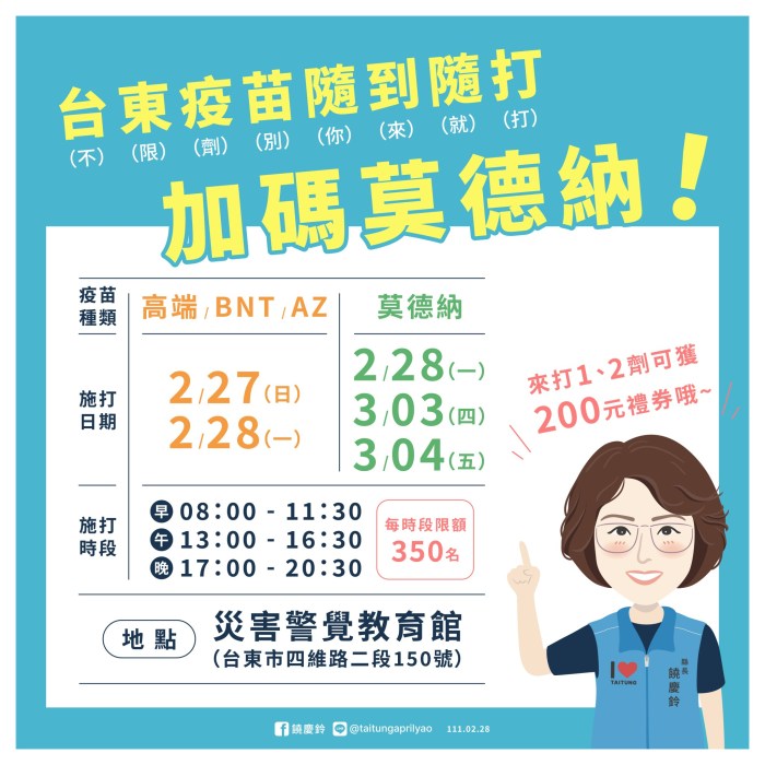 臺東縣新增莫德納隨到隨打 縣長饒慶鈴籲鄉親請踴躍接種